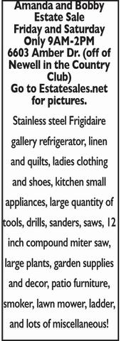 Amanda and Bobby Estate Sale - Friday and Saturday Only, 9AM-2PM - 6603 Amber Dr. (off of Newell in the Country Club). Go to Estatesales.net for pictures. Stainless steel Frigidaire gallery refrigerator, linen and quilts, ladies clothing and shoes, kitchen small appliances, large quantity of tools, drills, sanders, saws, 12 inch compound miter saw, large plants, garden supplies and decor, patio furniture, smoker, lawn mower, ladder, and lots of miscellaneous!
