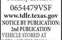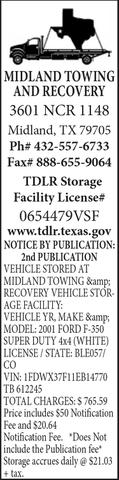 Midland Towing and Recovery, 3601 NCR 1148, Midland, TX 79705, Ph# 432-557-6733 Fax# 888-655-9064 TDLR Storage Facility License# 0654479VSF www.tdlr.texas.gov NOTICE BY PUBLICATION: 2nd PUBLICATION - VEHICLE STORED AT MIDLAND TOWING & RECOVERY VEHICLE STORAGE FACILITY; VEHICLE YR, MAKE & MODEL: 2001 FORD F-350 SUPER DUTY 4x4 (WHITE) LICENSE/STATE: BLE057/ CO VIN: 1FDWX37F11EB14770 TB 612245 TOTAL CHARGES: $ 765.59 Price includes $50 Notification Fee and $20.64 Notification Fee. *Does Not include the Publication fee* Storage accrues daily @ $21.03 + tax.
